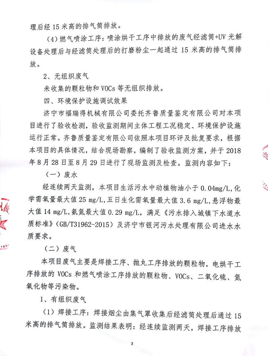 濟寧市福瑞得機械有限公司年產(chǎn)2600臺小型機械及12000噸機械配件加工項目(廢氣、廢水)竣