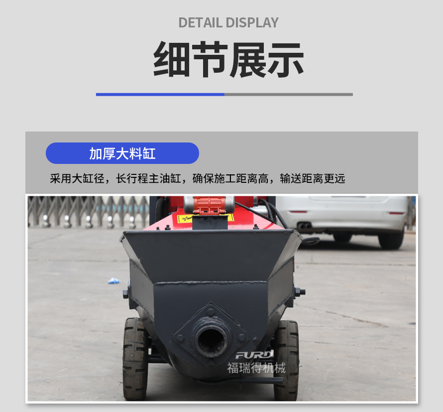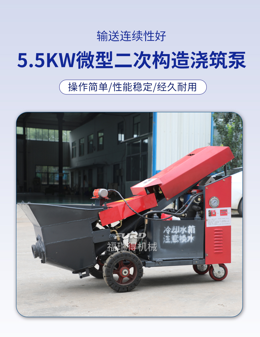 福瑞得二次結(jié)構(gòu)澆筑泵適用于商品房、農(nóng)村建房,打二次構(gòu)造柱,圈梁等,是您澆筑的好設(shè)備。電機(jī)功率小,體積小,重量輕,料斗可升降,真正能提高您的施工效率,是人工澆筑的幾十倍。