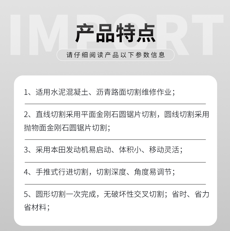 井周切縫機適合水泥混泥土、瀝青路面切割維修;既可以做直線路面切縫機使用,也可以做圓形路面切縫機;獨特的圓形切割能力省去了普通切縫機多次交叉破壞性切割的麻煩,效率是普通切縫機的10倍以上。